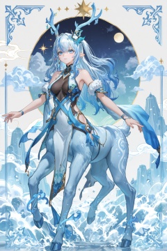 8k,masterpiece,best quality,amazing quality,very aesthetic,absurdres,(ultra-detailed),(high detailed skin),((artist:betabeet)),artist:john_kafka,artist:nixeu,artist:quasarcake,original,normal_quality,(by xilmo, by modare, by reoen:1.1),(hyperrealistic:1.1),(high_contrast:1.1),(holy_(\theme\):1.2),(card_\(theme\):1.1),solo,long hair,fur trim,large breasts,(white-color-scheme:1.1),character card,abstract sun,moon and stars,thick line,solo,<lora:weimo-noob-Tanger-000013:0.8>,weimo \(book of yog\),feibai,clothes: feibai clothes,feibai qipao dress,feibai hair ornament,feibai blue-and-white deer horns,feibai detached sleeves,1girl,breasts,blue eyes,white hair,blue hair,multicolored hair,long hair,bare shoulders,asymmetrical dress,small breasts,loli,full body,cute,dynamic pose,<lora:Laumays-ill-Tanger:0.5>,deer girl,1girl,centaur,monster girl,antlers,tail,blue fur,pointy ears,long hair,breasts,short deer tail,short tail,<lora:neg101-000008:0.45>,murals,holy light,mural sun,simple white background,angels come,clouds,card border,frame pattern,