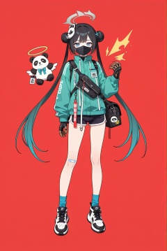 masterpiece,best quality,flat color,plane illustration,<lora:jijia-gnoobv-Tanger-000014:0.7>,jijia,2d,anime,1girl,black hair,bandaid,halo,red background,long hair,solo,bandaid on leg,hair bun,mask,bag,double bun,barcode,mouth mask,socks,looking at viewer,full body,twintails,claws,multicolored hair,hair ornament,blue eyes,bangs,wings,very long hair,shorts,an anime character with a panda on her arm,this is a drawing of a anime girl with different outfits,