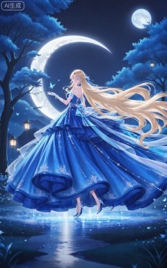 lvjing, 1girl, dress, long hair, blonde hair, solo, blue dress, tree, blue theme, closed eyes, moon, gloves, night, high heels, very long hair