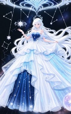 lvjing, 1girl, dress, long hair, white hair, hair ornament, solo, white dress, blue dress, full body, constellation, bare shoulders