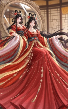lvjing, 1girl, dress, jewelry, hair ornament, mirror, red dress, long hair, black hair, forehead mark, chinese clothes, flower, earrings, necklace, facial mark, solo, hair rings, long sleeves