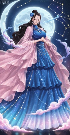 lvjing, 1girl, dress, long hair, solo, hair ornament, full body, blue dress, jewelry, constellation, sparkle, hair bun, facial mark, moon, forehead mark, black hair, earrings