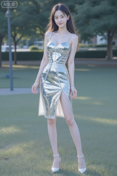 Photograph of a young woman with long black hair, standing on the park. She has a fair complexion and a gentle smile. wearing a form-fitting, silver and gold mirrored mid-length dress with intricate geometric patterns. The dress has thin straps, and a high slit on the left side, revealing her right thigh. She wears a gold bracelet on her right wrist. Her skin is fair, and she has a neutral expression. The lighting highlights the reflective qualities of her dress, adding a shimmering effect. The overall style is modern and glamorous., mirror dress, This dress is decorated with many mirrors that can capture light and create a sparkling effect. She is also wearing white high-heeled shoes with ankle straps. Her arms are relaxed by her sides, and she stands with a slight tilt to her right. The lighting is soft, highlighting her delicate features. The overall style is elegant and whimsical. long legs,