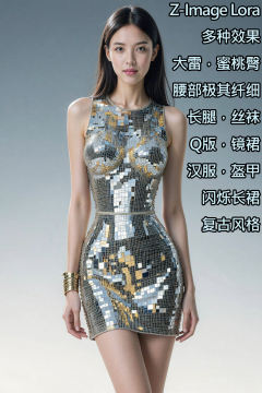 This is a high-fashion photograph of a slender young woman with long black hair, perfect eyes, light pink lipstick, large breasts, extremely slim waist, wearing a form-fitting sleeveless dress made entirely of small, reflective silver and gold mosaic tiles, revealing her smooth, light-toned legs. She accessorizes with large, gold bangles on her right wrist. The background is a gradient of light gray to white, emphasizing the dress's shimmering texture. The image is well-lit, highlighting the dress's intricate tile pattern and the model's elegant posture. The overall style is modern and glamorous, reminiscent of high-fashion runway designs., mirror dress, This dress is decorated with many mirrors that can capture light and create a sparkling effect.<lora:20251230_TinZ-ImageMultipleLora10:0.8>