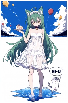 1girl, solo, long hair, breasts, looking at viewer, dress, holding, animal ears, bare shoulders, very long hair, standing, yellow eyes, ahoge, small breasts, food, green hair, sky, barefoot, cloud, cat ears, water, white dress, official alternate costume, blue sky, see-through, strapless, bell, wading, plate, cake, fork, balloon, holding plate, cake slice, akashi \(azur lane\)