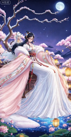 lvjing, 1girl, long hair, white hair, dress, night, lantern, white dress, hair ornament, solo, moon, flower, sitting, sky, night sky, tree, chinese clothes, lotus, branch, star \(sky\), full body