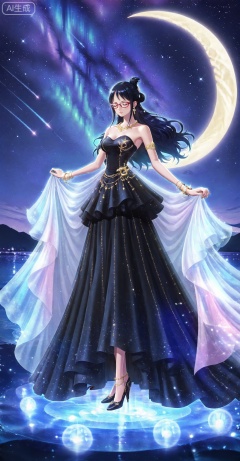 lvjing, 1girl, dress, solo, star \(sky\), long hair, moon, starry sky, sky, crescent moon, night, full body, night sky, jewelry, standing, bracelet, bare shoulders, closed eyes, breasts, black dress, shooting star, strapless dress, long dress, high heels