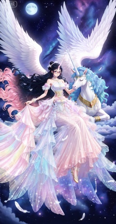lvjing, pegasus, long hair, star \(sky\), wings, 1girl, solo,unicorn, dress, moon, pink hair, starry sky, sky, single horn, feathered wings, horns, feathers, closed eyes, night sky, night, white dress, very long hair, blue eyes, full moon, white wings, bare shoulders