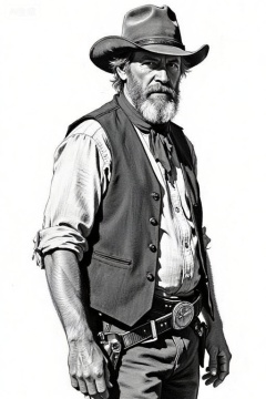 A black and white pencil drawing of a rugged middle-aged man with a beard, wearing a wide-brimmed hat, vest and shirt, his expression, with a gun holster at his waist, against a pure white background, highlighting the details of his clothing and facial features, shadows and textures.