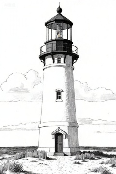 A black-and-white, detailed, pencil drawing of a lighthouse. The lighthouse is cylindrical with a small, enclosed balcony at the top. It stands on a sandy beach with a wooden fence and a path leading to the entrance. The sky is partly cloudy. The drawing has a vintage, illustrative style.,