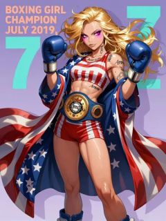 ANIFACZIT: A hyper-detailed, ultra-saturated anime-style illustration depicts a confident, golden-blonde boxing champion girl standing center-frame under soft studio lighting, winking seductively while draped in a flowing American flag-themed robe adorned with stars and stripes; her muscular physique gleams beneath tight red-and-white striped shorts and matching crop top, revealing intricate tattoos — “Never” across ribs, “Arrow” along midsection — as she holds blue Everlast gloves aloft like trophies; gold championship belt emblazoned with crown insignia rests at waistline, its metallic surface reflecting ambient glow; voluminous hair cascades dynamically around shoulders, eyes glowing with smoky pink eyeshadow and glittering star-shaped cheek accent; background features bold peach text reading “BOXING GIRL CHAMPION JULY 2019,” alongside large teal numeral ‘7’ against pale lavender backdrop; sharp linework, glossy skin textures, dramatic shadows cast by fabric folds enhance depth, evoking cinematic motion within stylized comic-book artistry fused with high-end fashion realism. <lora:Anime_Factory_E6_ZIT:0.4>