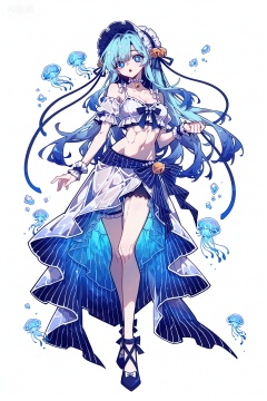 1boy, solo, ice blue jellyfish-like hair, transparent wavy hair, bioluminescent hair tips, light amber jellyfish eyes, glowing pupils, innocent expression, soft gaze, slightly open mouth, pale translucent skin, bioluminescent blue blush, jellyfish humanoid, full body jellyfish transformation, jellyfish tentacle limbs, transparent tentacles with bioluminescent blue stripes, floating tentacles, jellyfish bell-shaped skirt, sheer bioluminescent blue overlay, white camisole, light blue lace trim, ice blue cropped blouse, puff sleeves, white bow, white pearl choker, light blue ribbon wristbands, standing pose, floating posture, ethereal movement, solid white background, no other background elements, bioluminescent glow, transparent texture, delicate line art, soft shading, no watermark, no text, marine fantasy, pure and ethereal aesthetic