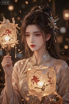 A young Chinese woman,alone,short hair,Close-up,1girl,Without wearing any clothing,half body unbuttoned buttonabsurdres, Japanese kimono, ,holding a traditional paper lantern,rabbit-themed lantern,traditional clothing,Hanfu,white blouse,intricate embroidery,wooden hair sticks,tied hair,serene expression,low-light setting,warm illumination,lantern festival,blurred bokeh background,nighttime,cultural celebration,medium shot,focus on person,soft lighting,festive atmosphere,gentle smile,traditional Chinese attire,festive night,decorative accessories,calm background,subtle makeup,candid moment,cultural heritage,festive lights,Chinese New Year,depth of field,delicate craftsmanship,handheld lantern,cultural tradition,peaceful ambiance,traditional festival attire,celebration of light,luxueqi