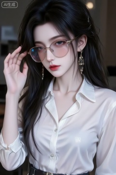 1girl, solo, long hair, shirt, black hair, jewelry, collarbone, upper body, earrings, parted lips, glasses, collared shirt, belt, hand up, lips, makeup, scar, sunglasses, lipstick, red lips, tinted eyewear,huaxiangr,luxueqi
