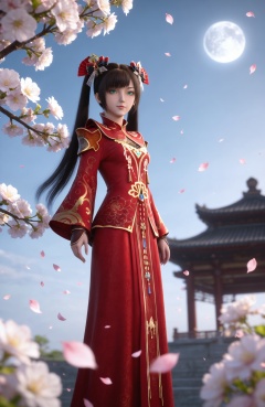 <lora:神墓1-楚钰-婚服pony:0.7> 1girl, black hair, twintails, hair ornament, jewelry, green eyes, china dress, red dress, long hair, wide sleeves, red footwear, masterpiece,best quality,amazing quality,very aesthetic,high resolution,ultra-detailed,absurdres,scenery,photorealistic,looking at viewer,moody lighting,realistic,photorealistic details,, masterpiece,best quality,solo,1girl,upper body,petals,looking at viewer,moon,branch,cherry blossoms,flower,extreme aesthetic,(quasarcake:0.7),masterpiece,best quality,good quality,newest,very aesthetic,absurdres,A shot with tension,(Visual impact,giving the poster a dynamic and visually striking appearance:1.2),impactful picture,offcial art,colorful,splash of color,movie perspective,, realistic style,white background,upper body,looking at viewer,dynamic posture,