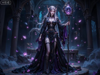 GCCA,A pale elven sorceress with waist-length black hair (streaked with silver, tangled with thorny vines), wearing a tattered dark velvet gown (embellished with glowing purple runes, tattered lace sleeves), holding a gnarled wooden staff (topped with a pulsating black crystal), kneeling on a mossy stone platform, sharp elven ears, dark eye sockets with glowing violet pupils, hyper-detailed texture (frayed fabric, rough staff wood)