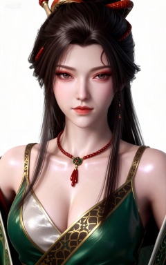 longjiaonan, 1girl, solo, breasts, looking at viewer, jewelry, long hair, cleavage, necklace, hair ornament, makeup,eyeshadow,red_lips_,white background, brown hair, realistic, black hair, simple background, closed mouth, green dress, bare shoulders