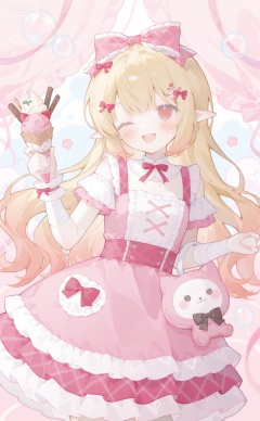 00naieps10, 1girl, solo, long hair, looking at viewer, blush, smile, open mouth, blonde hair, hair ornament, red eyes, dress, bow, ribbon, flower, hair bow, frills, one eye closed, food, stuffed toy, frilled dress, ;d, candy, pink dress, ice cream, ice cream cone, too many