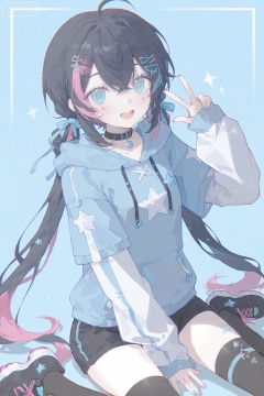 masterpiece,very aware,highres,absurdres,newest,best quality,high quality,petite,chromatic_aberration,lens_flare,dynamic_angle,cinematic_angle,//,00ilxl10,artist:konya_karasue,//, 1girl, solo, blue eyes, thighhighs, twintails, smile, looking at viewer, long hair, black thighhighs, long sleeves, choker, multicolored hair, sitting, open mouth, nail polish, star (symbol), bangs, shoes, black hair, wariza, ahoge, black choker, blue hair, hand between legs, shorts, multicolored clothes, pink hair, jacket, hair between eyes, low twintails, v, between legs, blush, black footwear, blue nails, hand up, blue jacket, sneakers, hood, :d, hoodie, border, ribbon, puffy sleeves, puffy long sleeves, black shorts, streaked hair, multicolored jacket, hair ribbon, layered sleeves, pink nails, blue border, hood down, virtual youtuber, blue hoodie, w, blue background, facial mark, drawstring, two-tone hair, short over long sleeves, short shorts, hair ornament, eyelashes, framed, crossed bangs, very long hair, facial tattoo, multicolored nails, outside border, sidelocks, short sleeves, sparkle, shirt,