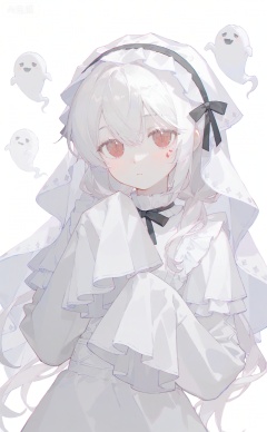 1girl, red eyes, long hair, solo, looking at viewer, sleeves past wrists, dress, white dress, veil, white hair, long sleeves, sleeves past fingers, white theme, upper body, ghost costume, facial mark, closed mouth, black ribbon, blush, hair between eyes, frills, expressionless, white background, ghost, frilled sleeves, sidelocks, hands up, simple background, grey theme, ribbon