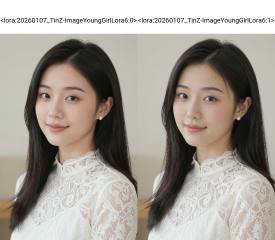 A photograph of a young Asian woman with fair skin and long, straight black hair. She has delicate features, wearing a white lace blouse with a high collar. Her makeup is subtle, with a natural look. She has small pearl earrings and a soft smile. The background is a blurred, light-colored wall, creating a serene and elegant atmosphere. The image captures her in a close-up, emphasizing her calm and poised expression. <lora:20260107_TinZ-ImageYoungGirlLora6:0>