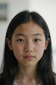 This slightly dimmed close-up portrait depicts an Asian 15 year-old girl with long parted black hair. Her features are sharp, with realistic skin tones and pores visible. Her eyes, deep and slightly smiling, gaze directly at the viewer. The realistic skin tones and pores are clearly visible, numerous freckles and red acne bumps and blemishes and her complexion is relatively fair. The soft lighting casts subtle shadows, highlighting the facial features and creating a cinematic atmosphere. The blurred white background creates a striking contrast, highlighting the subject. The facial contours are sharp, and the realistic skin tones are clearly visible. The work exhibits a modern, minimalist aesthetic, reminiscent of a studio scene or portrait. The overall atmosphere is restrained and slightly melancholic, creating a sense of fragility. The composition is balanced, with the subject positioned centrally. The perspective is frontal. The work is distinctive in style. <lora:20260107_TinZ-ImageYoungGirlLora6:1>