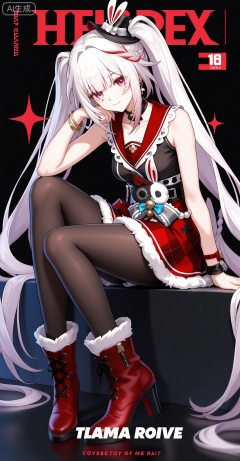 1girl,boots,fur trim,jewelry,hat,long hair,breasts,red footwear,skirt,fur-trimmed boots,earrings,sitting,red skirt,bracelet,high heels,full body,looking at viewer,belt,closed mouth,sleeveless,high heel boots,copyright name,bangle,english text,black pantyhose,cover,medium breasts,black shirt,shirt,fur-trimmed skirt,46,
