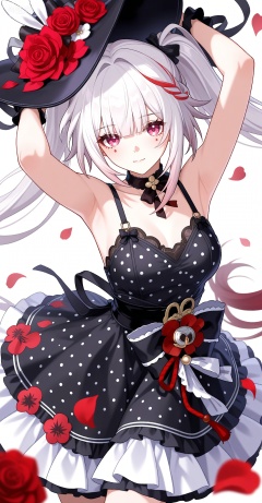 1girl, breasts, solo, polka dot, flower, dress, rose, polka dot dress, large breasts, red flower, armpits, petals, red rose, arms up, sideboob, sleeveless, frills, rose petals,