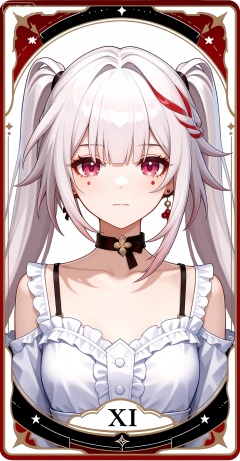 1girl,solo,earrings,jewelry,looking at viewer,breasts,tarot,collarbone,upper body,dress,closed mouth,card \(medium\),tarot \(medium\),frills,border,