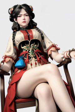 masterpiece,best quality,absurdres,highres,mature female,glamor,(slender:1.1),solo,<lora:金玉环-ill:0.85>,jingyuhuan,multi-tied hair,hair ornament,long hair,black hair,twin braids,braided hair rings,earrings,brown eyes,brown_pupils,disgust,jitome,BREAKhigh collar,puffy short sleeves,waist belt,waist sash,ornate belt,high-waist skirt,long skirt,blue pouch,wrist cuffs,gold chain,high heels,short shorts,sitting,pov,from below,chair,crossed legs,BREAKsimple background,white background,