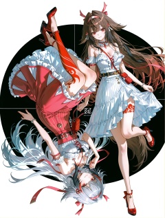 8k,best quality,masterpiece,(ultra-detailed),(high detailed skin),artist:john kafka,(artist:wanke:0.9),artist:fuzichoco,artist:quasarcake,(artist:nixeu:0.8),simple_black_background,black and white theme,Sense of coordination,sense of order,mathematics beauty,(((cover design))),(((((cover art))))),((trim)),album_art,official art,(Master's work),2girls,multiple girls,smile,full body,closed mouth,long hair,white background,looking at viewer,dual persona,upside-down,<lora:Ye_Shunguang-noob-Tanger-000014:0.8>,(2girls:1.2) BREAKYe Shunguang \(Zenless Zone Zero\),brown hair,brown animal ears,a red left thigh band tattoo,(clothes: guang pink skirt,pink skirt:1.2),guang white corset-style top,guang white detached armlets,red wrapping ribbons,guang white and pink hairband,red hair ribbons,1girl,long hair,breasts,smile,red eyes,red footwear,guang red small crossbody bag,high heels BREAKYe Shunguang \(Zenless Zone Zero\),albino state,grey hair,grey animal ears,asymmetric red leg tattoos,extensive red left leg tattoo,single see-through horn,clothes: guang pink skirt,guang white corset-style top,guang white detached armlets,red wrapping ribbons,guang white and pink hairband,red hair ribbons,1girl,long hair,red eyes,red footwear,guang red small crossbody bag,high heels BREAK