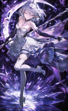 masterpiece,absurdres,best quality,petite,high quality,//,1girl, solo, gloves, elbow_gloves, dress, jewelry, pointy_ears, black_gloves, holding, strapless_dress, earrings, necklace, breasts, bare_shoulders, holding_scythe, strapless, full_body, high_heels, white_dress, holding_weapon, tiara, white_hair, gem, purple_theme, leg_up, weapon, closed_mouth, white_pantyhose, standing_on_one_leg, cleavage, scythe, short_hair, tutu, looking_at_viewer, purple_gemstone, light_particles, hair_ornament, medium_hair, collar, pantyhose, chromatic_aberration, standing, choker, flower, glint, purple_eyeshadow, smile, crystal, frills, blue_gemstone, frilled_dress, eyelashes, eyeshadow, ballerina, small_breasts, medium_breasts, back_bow, dangle_earrings, ice, white_footwear, piercing, chest_tattoo, grey_eyes, bug, crescent, thighhighs, abstract_background, makeup, grey_hair, circlet, ear_piercing, butterfly, collarbone, ballet_slippers, blue_eyes, long_eyelashes, half-closed_eyes, crown, white_theme, purple_eyes, white_thighhighs, black_collar, looking_to_the_side, short_dress, expressionless, mole, sleeveless, parted_lips, sparkle, grey_footwear, glass, layered_dress, pleated_dress, headpiece, hair_between_eyes, white_eyes//,<lora:ssxd——【noob】hans:1>,