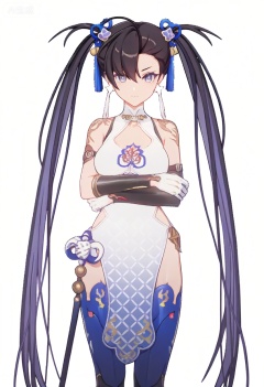1girl, solo, long hair, breasts, looking at viewer, blue eyes, black hair, thighhighs, gloves, dress, twintails, jewelry, very long hair, earrings, white gloves, gradient, chinese clothes, china dressmasterpiece, best quality, transparent_background, game_cg, masterpiece, best quality, transparent_background, game_cg, arms_crossed, 😡,