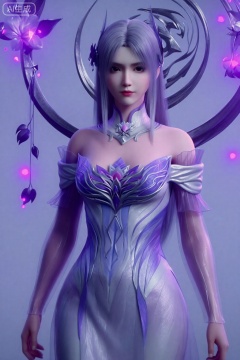 真人摄影。  。她的服装是一件合身、华丽的连衣裙,胸部有突出的精致设计,混合了紫色和银色。这款连衣裙采用露肩袖设计,采用分层透明面料。在她的身后,有巨大的翼状结构,上面有花朵和叶子的图案,闪烁着柔和的紫色光芒。,小医仙
