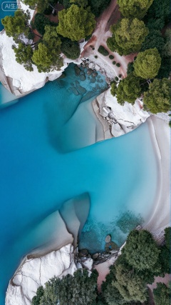 海岸场景的航拍照片。清澈的绿松石色大海,随着远离海岸,海水逐渐转变为更深的幽蓝色。海岸线分布着岩石,其中点缀着白色的风化岩石。水面之上,茂密的绿色松树覆盖着山坡,形成了郁郁葱葱的森林区域。一条狭窄蜿蜒的土路穿梭过树林,径直通向岩石海岸。阳光铺洒在水面,突出了它的澄澈透明度,还隐约露出了下方的岩石海底。整体构图捕捉了充满活力的蓝色大海、浓郁绿色森林与白色岩石之间的鲜明对比,营造出如诗如画的自然景观,精美手机壁纸。