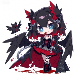 1girl, solo, charcoal black hair, ink black hair, long curly hair, red rose hair ornament, black feather hair accessories, ice blue-gray eyes, cold gray-blue eyes, narrow eyes, cold expression, smirks, red rose petal in mouth, pale skin with red blush, gothic dark style, black lace camisole, black multi-layered torn cape, red satin lining, red rose decorations, metal cross buckle, black ruffled long skirt, gray polka dot pattern, red inner skirt, black knee-high lace-up boots, metal chain decorations, black choker, red rose pendant, standing pose, body tilt right, lifting skirt, floating cape, floating hair, raven motif, black phoenix butterfly motif, blood splatter effects, monster girl, animalistic limbs, raven claws on hands and feet, black raven wings, feathered wings, taloned feet, demonic lower body, twisted monster legs, pure white background, solid white background, no other background elements, no watermark, no text, elegant and aloof, yandere aesthetic, delicate line art, soft shading, dark fantasy, horror gothic