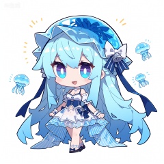 1 girl, breasts, cleavage, (chibi:1.1) ,:d,//artist:chujiujiu:1.4,//1girl, solo, ice blue jellyfish-like hair, transparent wavy hair, bioluminescent hair tips, light amber jellyfish eyes, glowing pupils, innocent expression, soft gaze, slightly open mouth, pale translucent skin, bioluminescent blue blush, jellyfish humanoid, full body jellyfish transformation, jellyfish tentacle limbs, transparent tentacles with bioluminescent blue stripes, floating tentacles, jellyfish bell-shaped skirt, sheer bioluminescent blue overlay, white camisole, light blue lace trim, ice blue cropped blouse, puff sleeves, white bow, white pearl choker, light blue ribbon wristbands, standing pose, floating posture, ethereal movement, solid white background, no other background elements, bioluminescent glow, transparent texture, delicate line art, soft shading, no watermark, no text, marine fantasy, pure and ethereal aesthetic