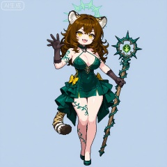 White background, full body monster, 1girl, dark brown curly hair with green vines and golden butterfly decoration, golden slit pupils, sharp fangs, leopard ears and scaly tail, clawed fingers, tattered emerald green and brown vintage dress, long black gloves, bone cane decorated with thorns, pale skin with dark vein pattern, aristocratic elegance, gothic horror style, high details, cinematic lighting