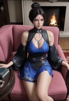 masterpiece,best quality,amazing quality,high resolution,ultra-detailed,absurdres,(looking at viewer:1.1),upper body,(moody lighting:1.1),(large breasts:0.8),1girl,long hair,makeup,BREAKcollarbone,bare shoulders BREAK photorealistic details,indoors,sitting on the carpet,smooth floor,fireplace,flambe,coffee_table,pink sofa,food,item,book,leg lift,<lora:青玉gh:0.8>,black hair,cleavage,dress,facial mark,forehead mark,hair bun,short hair,wide sleeves,
