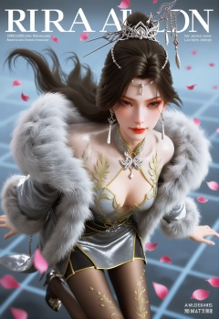 score_9,score_8_up,score_7_up,1girl,solo,(advertising cover:1.2),magazine_cover,artistic signature,1girl,solo,realistic,fur-trimmed coat,fur trim,fur collar,fur coat,coat,fur cloak,dress,black dress,white dress,long sleeves,chinese clothes,black pantyhose,fine fabric emphasis,pantyhose,clothing cutout,breasts,cleavage cutout,high heels,realistic,jewelry,tiara,collar,tassel earrings,hair ornament,hair stick,tassel,earrings,1girl,solo,realistic,(mature face:1.2),big_eyes,slender face,shiny_skin,long hair,black hair,hair bun,ponytail,blue eyes,black eyes,makeup,eyeshadow,eyeliner,eyelashes,forehead jewel,forehead mark,red lips,bare shoulders,closed mouth,realistic,grey_background,gradient_background,(white_background:0.9),falling petals,(depth of field:1.2),depth_of_field,(looking at viewer:1.1),<lora:小巳-小巳-南宫仙儿-貂皮大衣pony:0.8>,