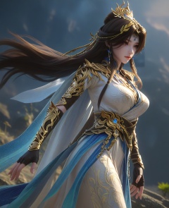 (Jumping with arms extended and legs tucked in,:1.1),(large breasts:1.2),<lora:XL16云深不知梦羲和第20集‌跃灵谷:0.95>,miss xihe,white and blue tiered hanfu,brown eyes,mole under left eye,black hair,very long hair,draped looped buns with front braid,hair ornament,jewelry,black fingerless gloves,cape,, score_9,score_8_up,score_7_up,score_6_up,score_5_up,score_4_up,3d rendering,tag1,tag2, Cinematic Lighting,backlighting,
