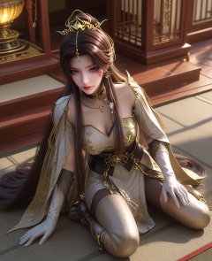 (oriental architecture, elegant decor, sophisticated style:1.1),(Elbows on knees, head resting on her hands,:1.1),From a high-angle vantage point,looking downwards,(large breasts:1.2),<lora:XL16云深不知梦羲和白色战斗服:0.95>,miss xihe,silvery white tiered dress,shawl,yellow eyes,facial mark,black hair,absurdly long hair,traditional chinese updo with long front strands,hair ornament,jewelry,sash,gloves,tights with attached boots,, score_9,score_8_up,score_7_up,score_6_up,score_5_up,score_4_up,3d rendering,tag1,tag2, Cinematic Lighting,backlighting,
