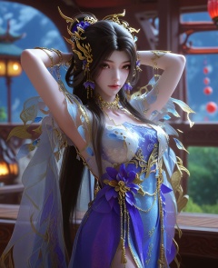 (oriental architecture, elegant decor, sophisticated style:1.1),(Arms behind head, on a wall,:1.1),(Diagonally from the front, giving a three-quarter perspective:1.1),(large breasts:1.2),<lora:XL16云深不知梦羲和第19集揽月湖:0.95>,miss xihe,white crop top,violet and blue tiered dress,brown eyes,black hair,long hair,draped looped buns,hair ornament,jewelry,earrings,bracelet,lantern,, score_9,score_8_up,score_7_up,score_6_up,score_5_up,score_4_up,3d rendering,tag1,tag2, Cinematic Lighting,backlighting,