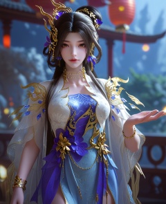 (oriental architecture, elegant decor, sophisticated style:1.1),(Legs wide apart, one hand trailing down her body as if to invite exploration, she exudes an irresistible sensuality:1.1),(Dolly zoom:1.1),(large breasts:1.2),<lora:XL16云深不知梦羲和第19集揽月湖:0.95>,miss xihe,white crop top,violet and blue tiered dress,brown eyes,black hair,long hair,draped looped buns,hair ornament,jewelry,earrings,bracelet,lantern,, score_9,score_8_up,score_7_up,score_6_up,score_5_up,score_4_up,3d rendering,tag1,tag2, Cinematic Lighting,backlighting,