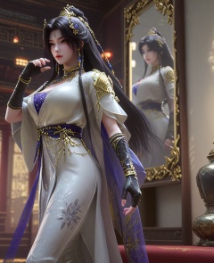 (oriental architecture, elegant decor, sophisticated style:1.1),(Legs crossed in front of a mirror,:1.1),(from back:1.1),(large breasts:1.2),<lora:XL16云深不知梦羲和缉魔司:0.95>,missxihe,white dress with tulle skirt,brown eyes,forehead mark,black hair,very long hair,half-up braid with long cascading hair,hair ornament,jewelry,earrings,black fingerless gloves,white thigh boots,wide flowing sleeves,blue violet bandeau,sash,, score_9,score_8_up,score_7_up,score_6_up,score_5_up,score_4_up,3d rendering,tag1,tag2, Cinematic Lighting,backlighting,