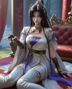 (oriental architecture, elegant decor, sophisticated style:1.1),(Sitting upright on a leather armchair, legs wide open, fingers delicately exploring the folds of her own body, she radiates an all-consuming passion that sets the very room alight with its intensity:1.1),(Bird’s-eye view:1.1),(large breasts:1.2),<lora:XL16云深不知梦羲和缉魔司:0.95>,missxihe,white dress with tulle skirt,brown eyes,forehead mark,black hair,very long hair,half-up braid with long cascading hair,hair ornament,jewelry,earrings,black fingerless gloves,white thigh boots,wide flowing sleeves,blue violet bandeau,sash,, score_9,score_8_up,score_7_up,score_6_up,score_5_up,score_4_up,3d rendering,tag1,tag2, Cinematic Lighting,backlighting,
