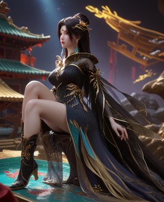(oriental architecture, elegant decor, sophisticated style:1.1),(Legs crossed,:1.1),from back,(large breasts:1.2),<lora:XL16云深不知梦羲和第9集:0.95>,miss xihe,ombre gown,yellow eyes,forehead jewel,black hair,absurdly long hair,traditional chinese updo with long cascading hair,hair ornament,jewelry,earrings,wide sleeves,boots,eyeshadow,, score_9,score_8_up,score_7_up,score_6_up,score_5_up,score_4_up,3d rendering,tag1,tag2, Cinematic Lighting,backlighting,