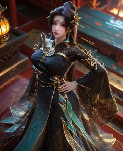 (oriental architecture, elegant decor, sophisticated style:1.1),(Lifting leg, hands on hips,:1.1),From above, looking straight down at the subject,(large breasts:1.2),<lora:XL16云深不知梦羲和第9集:0.95>,miss xihe,ombre gown,yellow eyes,forehead jewel,black hair,absurdly long hair,traditional chinese updo with long cascading hair,hair ornament,jewelry,earrings,wide sleeves,boots,eyeshadow,, score_9,score_8_up,score_7_up,score_6_up,score_5_up,score_4_up,3d rendering,tag1,tag2, Cinematic Lighting,backlighting,