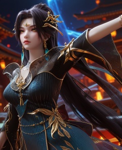 (oriental architecture, elegant decor, sophisticated style:1.1),(On her toes, arms stretched out,:1.1),close-up,(large breasts:1.2),<lora:XL16云深不知梦羲和第9集:0.95>,miss xihe,ombre gown,yellow eyes,forehead jewel,black hair,absurdly long hair,traditional chinese updo with long cascading hair,hair ornament,jewelry,earrings,wide sleeves,boots,eyeshadow,, score_9,score_8_up,score_7_up,score_6_up,score_5_up,score_4_up,3d rendering,tag1,tag2, Cinematic Lighting,backlighting,