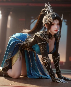 (oriental architecture, elegant decor, sophisticated style:1.1),(all fours, elbows on the ground,:1.1),Directly from the side, giving a perfect lateral perspective,(large breasts:1.2),<lora:XL16云深不知梦羲和融合玄凤:0.95>,miss xihe,black wrap coat with blue overdress,shoulder armor,brown eyes,black hair,very long hair,ponytail,hair ornament,jewelry,chain ornament,gauntlets,sash,blue to white ombre base skirt,cape,, score_9,score_8_up,score_7_up,score_6_up,score_5_up,score_4_up,3d rendering,tag1,tag2, Cinematic Lighting,backlighting,